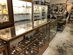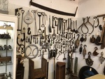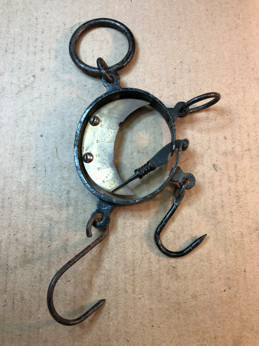 This weeks feature item is this Henry Boker & Co. buffalo hide scale. They were used from the 1840's to the 1880's by the plainsmen, buffalo hunters and trappers to weigh the hides of Buffalo. The scales were strong and had two methods of weighing, and were carried in saddle bags. The frame is cast iron with a brass pinned half moon measuring scale. The scale was used in two methods of weighing. One side used the small hook and was used to weigh from 0 to 50 pounds, and the other side with the large hook was used to weigh 200 to 400 pounds. It measures 10" tall. $100.00 + tx