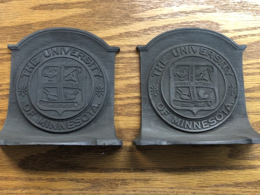 This weeks feature item is this pair of cast iron University Of Minnesota book ends. They are in excellent condition and measure 6 1/4" tall overall X 6 1/4" wide overall. The backs are marked D. C. E. $75.00 + tx