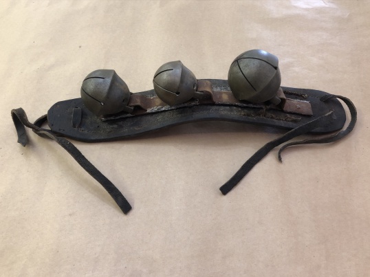 This weeks feature item are these 3 large antique brass sleigh bells on a wide leather strap. The 3 bells are in excellent condition. The leather is a little dried out but still pliable. It measures about 18 1/2" long overall. The bells are 3 different sizes, the largest one measures 3 1/4" in diameter, the next one measures 2 3/4" in diameter and the smallest one measures 2 1/4" in diameter. $175.00 + tx