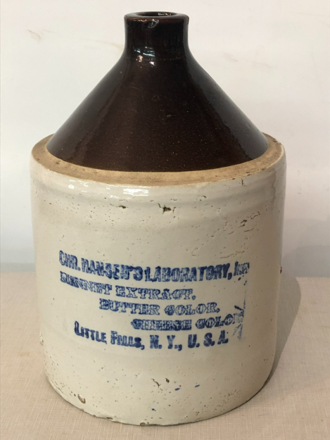 This weeks feature item is this 1800's 1 gallon 2 tone CHR. Hansen's Laboratory, INC shoulder jug. It is in very good to excellent condition, there are a couple of small chips on the lip and 2 spots where the brown glazing did not cover at the handle. It measures 10 3/4" tall X 7 1/4" in diameter. The side is marked in blue CHR. HANSEN'S LABORATORY, INC RENNET EXTRACT. BUTTER COLOR, CHEESE COLOR. LITTLE FALLS, N.Y., U.S.A. This great advertising piece would be an excellent addition to any collection and will display very well. $50.00 + tx
