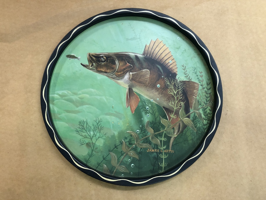 This weeks feature item is this vintage 11" James L. Artig walleye after a minnow round serving tray. $20.00 + tx